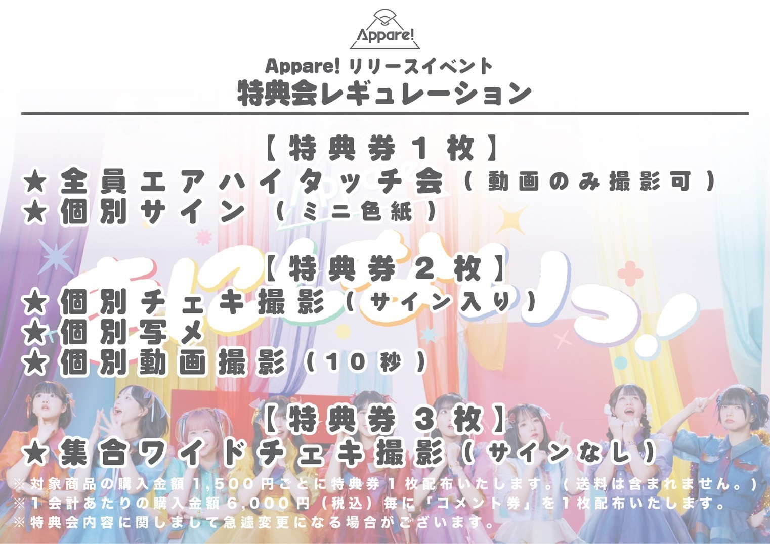 ※「整理番号付き入場券」、「特典券」、「コメント券」はいかなる場合(紛失・盗難等含む)においても再発行は致しませんのでご了承ください。