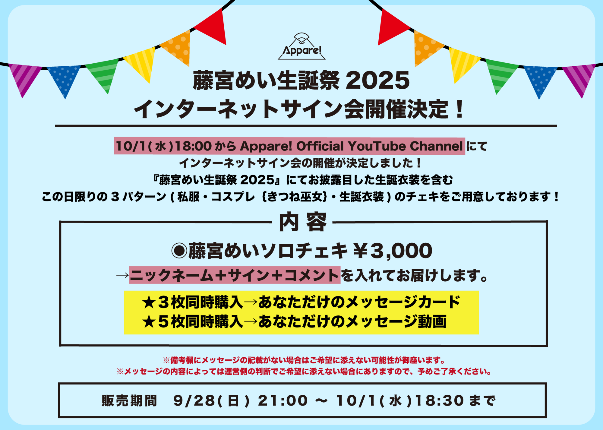 10/1(水)18:00よりAppare! Official YouTube Channelにて『藤宮めい生誕祭2025!インターネットサイン会』の開催が決定!